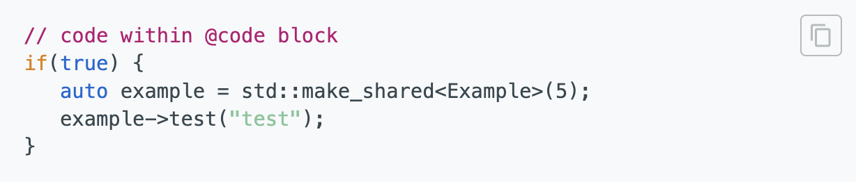 header.htmltemplate, includedoxygen-awesome-fragment-copy-button.jsat the end of the<head>and then initialize it:<html> <head> <!-- ... other metadata & script includes ... --> <script type="text/javascript" src="$relpath^doxygen-awesome-fragment-copy-button.js"></script> <script type="text/javascript"> DoxygenAwesomeFragmentCopyButton.init() </script> </head> <body>